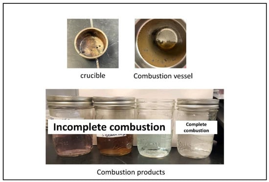 Incomplete combustion (Figure 5) means that the test is faulty, and you need to start over. A small amount of soot is expected, but if any uncombusted material is still present in the crucible it should be considered a failure.
