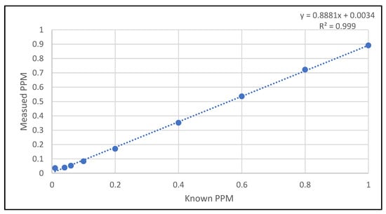 The method’s detection limit is determined by testing the F-ISE probe using standards of varying concentrations and plotting against the measured values (Figure 9) following the EPA procedures on detection and quantification under the Clean Water Act analytical methods []. One standard solution was prepared for each concentration and measured the mV value three times. The average mV values are then calculated based on a calibration curve to calculate the total fluorine concentration (ppm). The instrument limit of detection (ILOD) is identified to be 0.1 ppm, while the method limit of detection (MLOD) was calculated as 20 ppm using Equation (3).