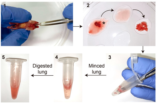 Figure 2. Protocol workflow. (1) Lung lobes attached to the heart are dissected from newborn mice without opening the peritoneal cavity. (2) Lung lobes in HBSS after elimination of heart, trachea, and other non-lung tissue. Asterisks indicate the discarded no-lung tissue. Arrows indicate the recommended washing steps in drops of HBSS to eliminate blood excess. (3) Lung lobes are minced with scissors in a 1.5 mL Eppendorf containing 0.5 mL of the Col/Disp digestion buffer. (4) Small pieces of the lungs after mincing. (5) Final appearance of fully digested lungs after Col/Disp and Trypsin incubations.