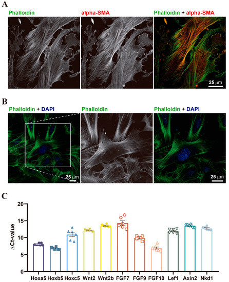 Immunofluorescence staining and RT-qPCRs confirming the purity of the primary lung fibroblast culture. (A). Alpha-smooth muscle actin (alpha-SMA) and phalloidin are used as positive markers. Scale bar 25 µm. (B). Phalloidin staining with DAPI counterstained nuclei. Scale bars: 25 µm. (C). Gene expression in newborn lung fibroblast of specific genes from the Hox-Wnt2-FGF axis.