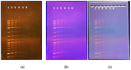 - Tuma, R.S.; Beaudet, M.P.; Jin, X.; Jones, L.J.; Cheung, C.Y.; Yue, S.; Singer, V.L. Characterization of SYBR Gold nucleic acid gel stain: A dye optimized for use with 300-nm ultraviolet transilluminators. Anal. Biochem. 1999, 268, 278–288. [Google Scholar] [CrossRef]