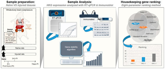 In the present study, we validated and identified appropriate control HKGs for genomic and proteomic data normalization in a variety of tissues in both the normal steady-state and pathological state following acute injury in a rat model of blast-associated combat-related lower limb trauma (Figure 1). By employing RT-qPCR and immunoblot techniques and computational analyses, we evaluated the variability in gene and protein expression among nine common HKGs: Actb, B2m, Gapdh, Hprt1, Pgk1, Rplp0, Rplp2, Tbp, and Tfrc. We used the RT-qPCR results and applied five independent and rigorous statistical algorithms to compare and rank HKG stability (i.e., RefFinder, Normfinder, BestKeeper, and geNorm, as well as the comparative Delta-Ct method [19,30,36,37,38,39]). In addition, we examined the tissue-level protein-coded expression of each HKG in the steady-state by immunoblots. Temporal changes in HKG expression between and within tissue types, both prior to and after injury, were investigated to define the most stable and comprehensive reference HKGs. This study highlights the importance of reference gene stability analysis and demonstrates how the improper choice of internal reference control HKGs can significantly impact the robustness of normalization and lead to data misinterpretation. Furthermore, we provide validated reference gene candidates for rat lung, kidney, liver, and skeletal muscle prior to and after acute extremity trauma.