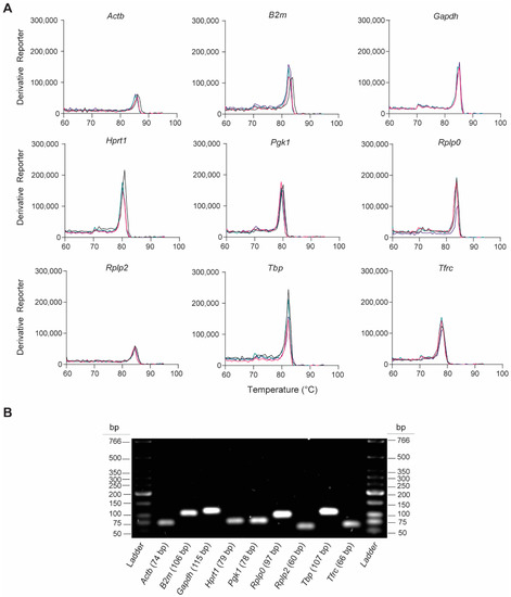 We assessed the gene-specific amplification of the nine rat-specific HKG RT-qPCR primers by analyzing the melting curves and qPCR amplicons. The melting curve analyses revealed single peaks for each primer pair, indicating the specificity of the RT-qPCR reactions (Figure 2A). This was confirmed by analyzing the final PCR products on the 2% agarose gel, which showed the presence of a single product at the expected amplicon size (Figure 2B and Table 1). These findings indicate that no primer dimers or nonspecific amplification products were formed.