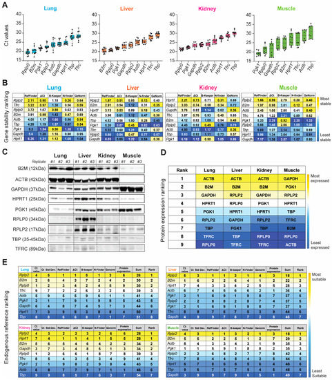 Based on both the gene and protein expression results depicted in Figure 3A–D, we summed the individual rankings of each of the eight different parameters to determine the most suitable HKG for each tissue in the naïve steady-state. The resultant ranking (max score: 64) indicated the suitability, with the lowest sum indicating the best suited. Unequivocally, Rplp2 was the most suitable endogenous reference for the healthy naïve lung, liver, and skeletal muscle, whereas Rplp2 and Hprt1 ranked equally for the kidney (Figure 3E).