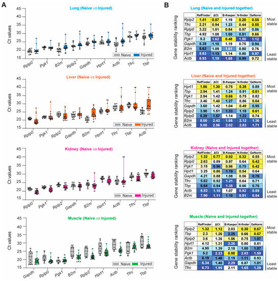 The aforementioned stability ranking scheme described for healthy tissue samples was applied following trauma-induced stimuli (Figure 4). Rplp0, Pgk1, B2m, Rplp2, and Gapdh were highly expressed among naïve and injured tissues, whereas Tbp and Tfrc were negligibly expressed (Figure 4A and Table S3). We observed the largest variation in expression in injured lung and liver tissue for all nine HKGs compared to the naïve. The greatest variability was detected in the kidney, as B2m (Ct: 23.47 ± 2.19; CV: 0.093) and Actb (Ct: 26.93 ± 4.75; CV: 0.176) had the most variable expression levels under traumatic injury conditions compared to the naïve. Compared to other tissues, CVs obtained from the injured skeletal muscle tissues were equal to or smaller than the CVs obtained for the naïve condition (Figure 4A and Table S3), indicating that the mechanical injury to the hindlimb and amputation does not result in the variability of HKG expression. Based on the computational algorithms alone, the stability rankings for each tissue type in the injured state were the most consistent in the lung and the least consistent in the liver (Figure 4B) compared to the stability rankings of the tissues in the naïve steady-state. Consistent with the gene expression results from the naïve steady-state, Rplp2 was the most stable reference gene for the injured lung, kidney, and muscle. However, there were observed differences in the stability ranking in the injured liver compared to the naïve steady-state, as Hprt1 ranked as the most stable in the injured liver (Figure 4B), whereas Hprt1 previously ranked third in the naïve steady-state. The rankings were the least consistent in the liver and the most consistent within the lung (Figure 4B).