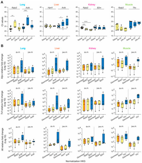 Dysregulated hyperinflammation involving a myriad of systemically released pro- and anti-inflammatory cytokines (“cytokine storm”) through the activation of the immune system can provoke many secondary injuries during the early recovery phase, including ischemia-reperfusion injury, multi-organ dysfunction syndrome (MODS), organ failure, and sepsis. Interleukin 6 (Il6), tumor necrosis factor (Tnf), and myeloperoxidase (Mpo) are just a few of the key factors/targets that play key roles in this response [62,63,64,65,66]. To demonstrate the profound impact of appropriate reference gene selection for calculating the relative gene expression of a specific target gene of interest, we analyzed the pro-inflammatory mediators Mpo, Tnf, and Il6 at 6 and 24 h post-injury using three normalization strategies: the identified most stable HKG, the least stable HKG, and a combination of the three most stable genes at each timepoint. First, we illustrate the raw mean Ct value variability of the most and least stable HKGs across the tissues and experimental conditions (naïve, 6 h, and 24 h post-injury; Figure 5A). The relative expression of the target genes examined was dependent on the normalization strategy used (Figure 5B). In general, the expression levels were, in many cases, strongly overestimated when using unstable HKGs for normalization. This was most apparent in the liver, particularly for calculating Mpo expression 6 h post-injury, where there was a 2-log expression difference using the least or most stable HKG(s).