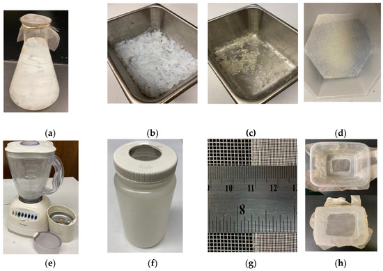 Figure 1. Processing of used agarose gels. (a) An Erlenmeyer flask with netting attached to the top allows for efficient removal of water from used gel slices. Gel slices are soaked in distilled water, then with ultrapure (Millipore, filtered) water, with one or more exchanges of water daily. (b) After freezing, chopping the gel into finer pieces, and another round of water leaching, gel slices are placed in a baking dish and baked at 55–60 °C until dehydrated; (c) depicts dried agarose flakes ready for grinding or storage; (d) agarose granules, the final product, after grinding and sifting; (e) blender and coffee/spice grinder used in processing; (f) depicts the freezer bottles, with lid configured for drainage of thawed pieces; (g) displays the relative sizes of the gray polyester mesh (from window screen replacement) used as a strainer for the Erlenmeyer flasks at the Diffusion Stations and after freezing (left). On the right is the bolting fabric used as the sieve for the final product; (h) depicts our lab-made sifters made from mesh fabric and a lightweight plastic box. At the top, looking down into the plastic box shows the size of the cutout in the bottom of the box. At the bottom, looking underneath the box shows that the bottom of the box is surrounded by mesh fabric. - ▪