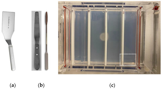 Figure 2. Convenience Gels. (a) Because “spatulas” have different shapes, depending on their application, a photo of a spatula is provided that is well-suited for slicing an appropriately sized gel from the Convenience Gel and transferring it to a working gel box; (b) a smaller spatula may also be required to help lift the excised gel piece from the Convenience Gel casting box; (c) a “Convenience Gel” with 4 rows of combs. Squares are cut from the Convenience Gel, as indicated by white dotted lines. Gel squares are transferred to a new gel box and used for gel electrophoresis. - ▪