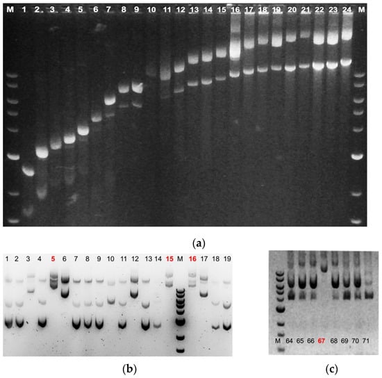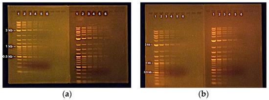 - Green, M.R.; Sambrook, J. Agarose Gel Electrophoresis. Cold Spring Harb. Protoc. 2019, 2019, pdb-prot100404. [Google Scholar] [CrossRef]