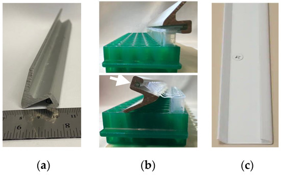 Figure 4. Example of a multi-microtube opener. (a) The narrow U-shape accommodates the lid of microtubes, and the metal is sturdy enough to serve as a lever. (b) At top, a row of closed microtubes is positioned for opening. At bottom, tubes are opened by twisting the metal in a circular motion over the top of the tubes. The white arrow highlights the 1 mL plastic pipette that was glued into this metal shape to make a narrower groove and better accommodate the microtube lids. (c) A product, used for shelving and hanging, that can be purchased inexpensively for this purpose. - ▪