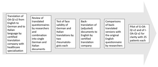 Step-by-step translation of the OsteoArthritis Quality Indicator version 2 questionnaire. Abbreviations: OA-QI v2 = OsteoArthritis Quality Indicator version 2; G-OA-QI v2 = German OA-QI v2; I-OA-QI v2 = Italian OA-QI v2. Reproduced with modification from Omair et al. [40] under a Creative Commons Attribution—NonCommercial (unported, v3.0) License (http://creativecommons.org/licenses/by-nc/3.0/, accessed on 31 December 2022). Copyright © 2021, The Authors. This reuse has not been endorsed by the licensor. The source reference is “[40]” and is available at https://www.ncbi.nlm.nih.gov/pmc/articles/PMC8253897/, accessed on 31 December 2022.