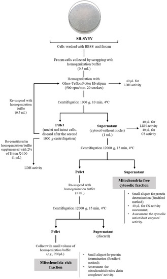 The frozen adherent cells were collected from the flasks by scraping after adding 0.5 mL of homogenization buffer (Sucrose 130 mM, KCl 50 mM, MgCl2 5 mM, KH2PO4 5 mM, HEPES 5 mM, pH 7.4) at 4 °C, and homogenized by using a 3 mL Glass-Teflon Potter Elvehjem homogenizer (Merck, Reference P7734-1EA; clearance of 0.004–0.006 in.) using 20 up- and downstrokes at 500 rpm. The mitochondria-free cytosolic and mitochondria-rich fractions were obtained by sequential differential centrifugation steps, as displayed in Figure 2, using standard procedures [10]. Typically, about 1 mL of mitochondria-free cytosolic fraction with a protein concentration of 1.0 mg/mL was obtained. In comparison, the mitochondria-rich fraction was collected in 200 µL with a protein concentration of about 0.5 mg/mL. The efficacy of Glass-Teflon Potter Elvehjem homogenizer to promote cell lysis was ensured measuring the lactate dehydrogenase (LDH) activity in cell homogenate, cell pellet reconstituted in 1 mL of buffer solution supplemented with 2% of Triton X-100, and in the supernatant fraction [11]. The procedure was suitable since LDH activity was not detected in 40 µL of the reconstituted pellet and more than 95% of this enzyme activity exhibited by cell homogenate is preserved in the supernatant fraction. As indicated in Figure 2, citrate synthase activity was assessed in supernatant, and mitochondria-free cytosolic fraction in addition to mitochondria-rich fraction to evaluate the purity of the fractionation methodology. In fact, the activity of this mitochondrial enzyme was not detected in the mitochondria-free cytosolic fraction and the activity detected in supernatant was preserved in the mitochondria-rich fraction.