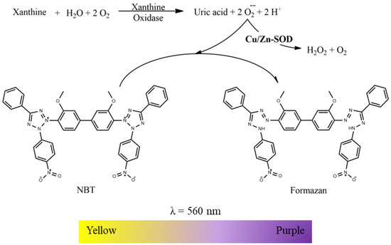 The xanthine/xanthine oxidase system generates O2•− disputed between Cu/Zn-SOD enzyme and the yellow NBT. Cu/Zn-SOD is responsible for the dismutation of O2•− into H2O2 and molecular oxygen, and the NBT reacts with the O2•− producing the formazan, detectable at 560 nm.
