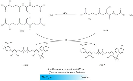 Oxidation of NADPH to NADP+ with reduction of GSSG to GSH by GR. The NADPH oxidation intensity is measured at 450 nm (setting excitation at 366 nm).