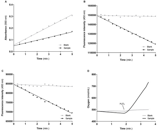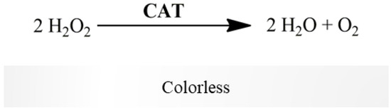 CAT reduces H2O2 to water and O2 (colorless reaction, Figure 6). CAT activity was determined polarographically following O2 production for 2–3 min, using a Clark-type oxygen electrode, resulting from H2O2 decomposition (Table 4) [16,17]. The difference between the slopes in the presence and absence of mitochondria-free cytosolic fraction determines CAT activity. It is expressed in terms of nmol O2 produced per minute per milligram of protein. CAT activity can be also assessed by the absorbance decrease at 240 nm [18]. We propose the assessment of CAT activity polarographically, since it is considered an accurate method, and compatible with complex biological samples, avoiding the matrix-related drawbacks underlying the UV-based absorption procedure [16]. Additionally, Hansatech Oxygraph Instrument allows to detect at each second changes in oxygen concentration of 0.01 nmol/mL range. Under our assay conditions, the 10-fold decrease in the biological sample (i.e., to 5 mg protein/mL) still allows reliably detection of CAT activity, as shown in the Supplementary Figure S1 (O2 production rate = 22.92 nmol/mL/min., corresponding to H2O2 consumption rate of 45.84 nmol/mL/min according with stoichiometric of the CAT-catalyzed reaction).