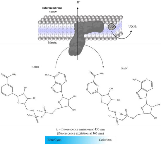 Complex I was evaluated spectrofluorimetrically following NADH oxidation, detected by the blue/cyan fluorescence decay, as illustrated in Figure 7 [17,23]. Thus, the time-dependent decrease in NADH fluorescence intensity is followed for 10 min at 450 nm (setting excitation at 366 nm) in the absence and presence of rotenone (Table 5). Complex I activity was determined by the difference between the slopes in the absence and presence of rotenone. A calibration curve of the NADH fluorescence intensity as a function of concentration, prepared in the same assay conditions, was used to convert the rate of NADH fluorescence decay promoted by Complex I activity in mol. Then, Complex I activity is expressed as nmol NADH oxidized per minute per mg of protein.