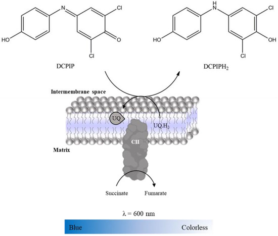 Complex II activity was evaluated spectrophotometrically following the reduction of DCPIP (color change from blue to colorless, Figure 8), which was used as an exogenous acceptor of the electrons. In assay conditions (i.e., Complex I is inhibited by rotenone, Complex III by antimycin A and Complex IV by KCN), succinate oxidation promoted by Complex II delivers the electrons for ubiquinone that promotes DCPIP reduction [17,24]. Thus, the time-dependent decrease in absorbance intensity at 600 nm (εDCPIP = 20,700 M−1 cm−1) in the absence and presence of oxaloacetate (competitive Complex II inhibitor [25]) is recorded in a microplate reader (Table 6). Complex II activity is determined by the difference between the slopes in the absence and presence of oxaloacetate. It is expressed as nmol DCPIP reduced per minute per milligram of protein. Considering the reactions in Complex II, the amount of DCPIP reduced is equal to the amount of fumarate formed by succinate oxidation. Thus, the activity can be expressed in nmol succinate oxidation per minute per milligram of protein.