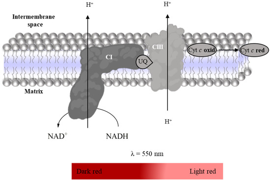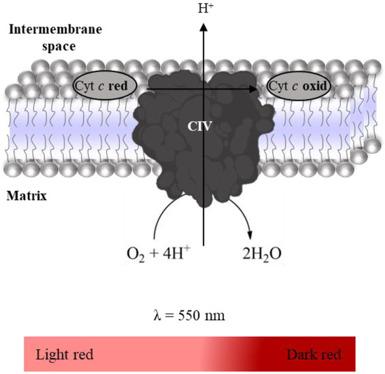 Complex IV activity was evaluated spectrophotometrically following the oxidation of reduced Cyt c (enzyme-substrate, εCyt c = 29,500 M−1 cm−1 [26]) at 550 nm (color change from light red to dark red, Figure 9) [27]. Thus, the time-dependent decrease in absorbance intensity at 550 nm in the absence and presence of KCN (Complex IV inhibitor) is recorded for 10 min using a microplate reader, as indicated in Table 7. The stock solution of reduced Cyt c was freshly prepared (in a spectrophotometer cuvette, Helios Alpha, UNICAM) by adding a volume of dithionite saturated solution required to increase the absorbance of Cyt c solution in 0.6 units at 550 nm after its saturation of nitrogen gas. In general, 10µL of dithionite solution is enough to reduce 3 mL of a Cyt c solution at 200 µM. Complex IV activity was determined by the difference between the slopes in the absence and presence of KCN, and it is expressed as nmol oxidized Cyt c per minute per milligram of protein.