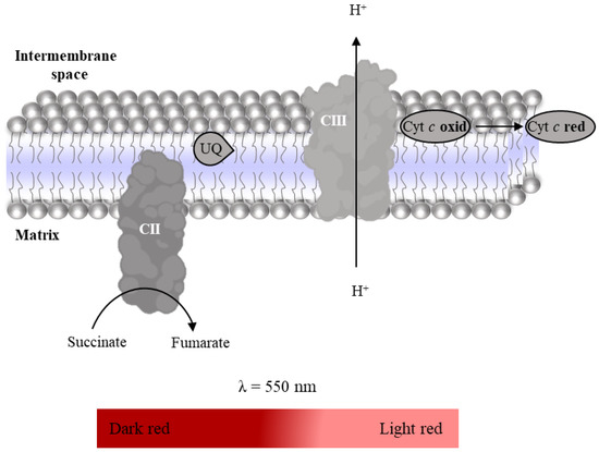 Complex II–III conjugated activity is evaluated spectrophotometrically following the reduction of oxidized Cyt c (enzyme substrate, εCyt c = 29,500 M−1 cm−1, Figure 11) at 550 nm after activation of the mitochondrial redox chain with succinate in the presence of rotenone and KCN to inhibit Complex I and Complex IV, respectively [27]. As indicated in Table 9, the time-dependent increase in absorbance intensity at 550nm promoted by the mitochondria-rich fraction in the absence and presence of antimycin (inhibitor Complex III) is recorded using a microplate reader. Complex II–III conjugated activity is determined by the difference between the slopes in the absence and presence of Complex III inhibitor. It is expressed as nmol reduced Cyt c per minute per milligram of protein.