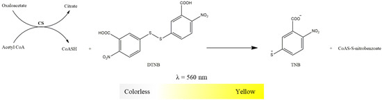 Reduction of DTNB with color change from colorless to yellow by the CoASH resulting from the condensation reaction of acetyl-CoA and oxaloacetate to form citrate promoted by CS.