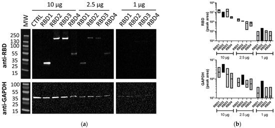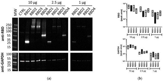 Lysates containing RBD proteins run by traditional WB. (a) Image of membranes immunoblotted with anti-SARS-CoV-2 RBD (1:2500) or anti-GAPDH (1:1000) Abs using traditional WB. (b) Floating box plots showing the minimum, maximum, and mean of the band volumes for RBD and GAPDH bands for RBD1–4 samples from three independent experiments that were obtained using Image Lab analysis. Lysates (10, 2.5, and 1 µg/lane) were from 293T cells transfected with plasmids expressing different-sized transgenes containing RBD (RBD1–4) or control transgene (CTRL). MW: PageRuler™ Plus Prestained Protein Ladder (Thermo Scientific).