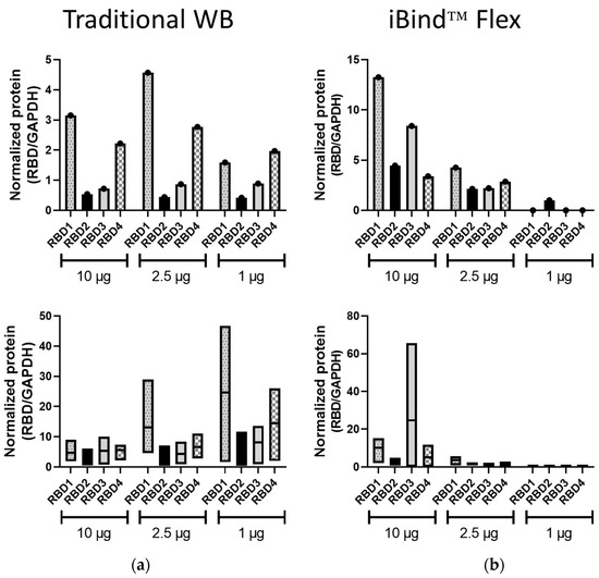 In addition to the traditional WB method and iBind™ Flex, the lysates from the transfected 293T cells were processed using the automated device JESS Simple Western™. Since both primary Abs were rabbit, a RePlex™ assay was utilized, which is analogous to stripping and reblotting in the traditional WB. While the RBD-containing proteins were clearly visible at all concentrations, the housekeeping protein GAPDH was very faint at 25 ng/µL and not always detectable at 12.5 ng/µL (Figure 4a and Supplementary Figure S2), highlighting the difference between overexpression of a transgene and the expression of an endogenous gene. It was also possible to visualize some smaller-sized products of the transgenes, which may be either different glycosylation forms of the proteins or partial products. Interestingly, only one of these was visible in the traditional WB and none were visible in the iBind™ Flex.
