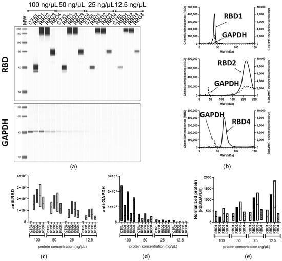 Assessment of transgene expression by JESS Simple Western™. Different concentrations (100, 50, 25, 12.5 ng/µL) of lysates from 293T cells transfected with vectors expressing RBD containing transgenes of different sizes (RBD1–4) or control transgene (CTRL) were processed in the fully automated JESS Simple Western™ device, probed with the SARS-CoV-2 RBD (1:50) and GAPDH (1:10) Abs. (a) Portrayal of a traditional blot-like image with a lane view of the samples. (b) An electropherogram representation of RBD1, RBD2, and RBD4 (50 ng/µL) samples for both the anti-RBD (solid line) and anti-GAPDH (dashed lines) analysis. Floating bar diagrams (minimum, maximum, and mean) of the peak areas corresponding to RBD (c) and GAPDH (d) protein from three independent experiments. (e) Floating bar diagram (minimum, maximum, and mean; n = 3) of the normalized RBD expression calculated from the peak areas of RBD and GAPDH signals.
