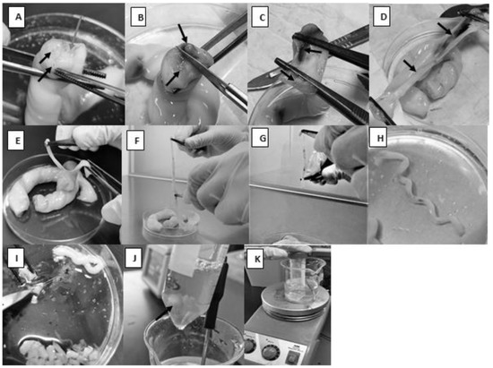 Figure 1. Dissection of the umbilical cord and preparation of the setup for artery enzymatic treatment. (A): The black arrows indicate the arteries and the white arrow indicates the vein. (B): A sagittal section that separates the two arteries from each other. (C,D): The two arteries with the surrounding tissues separated from each other. (E,F): Tissues around the artery removed. (G): Tunica adventitia is removed mechanically. (H): The spiral appearance of the artery. (I): Artery is being cut into 1–3 mm segments. (J): Arrow indicates the magnetic stir bar with the tissue pieces. (K): The whole setup for artery digestion. - A sterile scalpel was used to make a sagittal section that separates the two arteries from each other so that the vein would be cut longitudinally (Figure 1B).
