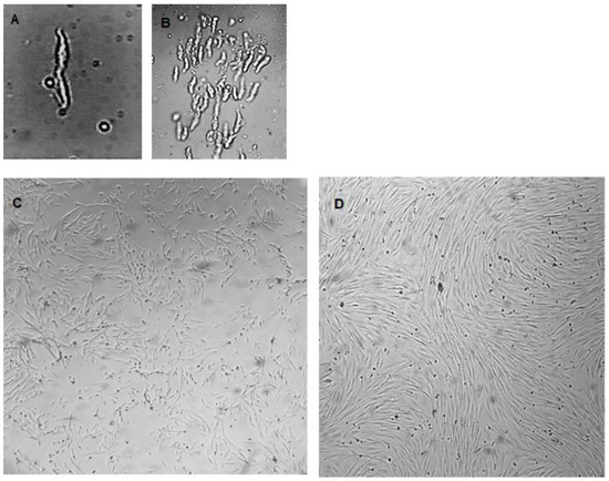 Primary cultured VSMCs were obtained using the described procedure. (A) A VSMC just after isolation and before attachment (magnification 400×), (B) VSMCs just after isolation and before attachment (magnification 100×), (C) synthetic VSMCs, (D) contractile VSMCs. (Magnification for (C,D) is 40×).