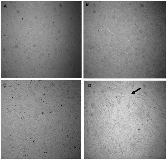 The isolated cells were viable to develop primary cultures. Figure 2A,B show VSMCs before attachment at different magnifications. The synthetic cells and more elongated spindle-like contractile VSMCs are shown in Figure 2C,D, respectively. VSMCs at different confluences are presented in Figure 3A–D. The nodules could be observed (Figure 3D, at the tip of the arrow).