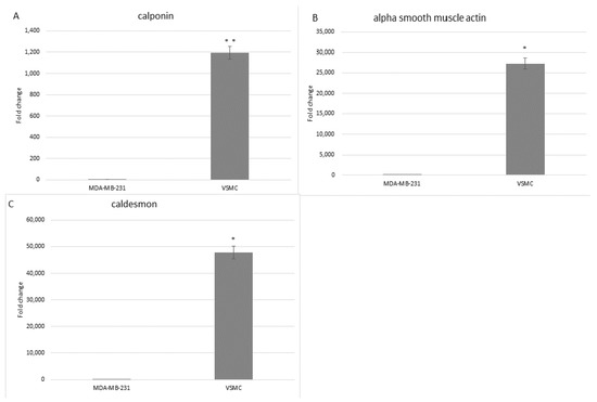Fold change expression of mRNA for calponin (A), α-smooth muscle actin (B), and caldesmon (C) determined by RT-qPCR, in both isolated VSMCs and MDA-MB-231 breast cancer control cells. GAPDH was used as a reference gene. This experiment was performed twice (* p < 0.0001; ** p = 0.001).