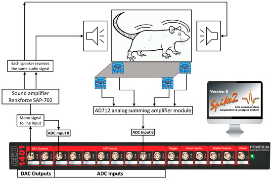 The procedure requires several pieces of equipment, including a data acquisition and control interface CED Power1401, controlled by Spike2 8.08 software (CED Power1401-3A, Cambridge Electronic Design, Cambridge, UK), a sound amplifier (Renkforce SAP-702, Conrad Electronic SE, Hirschau, Germany), a cage with two loudspeakers installed in the wall to present acoustic stimuli (Speaka Special DL-1152BK4, Conrad Electronic SE, Hirschau, Germany), a platform with four vibration sensors (ADXL335 accelerometer, Adafruit Industries, New York, NY, USA) to capture the animal’s startle response, and an analog summing amplifier module with AD712 operational amplifiers (Analog Devices, Wilmington, MA, USA) that combines inputs from the four accelerometers into a single output. The models listed above are the ones used in our laboratory and can be substituted by other devices with the similar functional properties. A block diagram of the system is shown in the Figure 1. Three channels of the data acquisition and control interface are used for this procedure. The first channel is a digital–analog output channel (DAC output 0, Figure 1), which sends mono signal to the line input of the sound amplifier. Although the sound amplifier supports two stereo channels, each loudspeaker receives the same audio signal. The same channel also sends its output to an analog–digital input channel (e.g., ADC input 0, Figure 1) to record the output and to mark the precise moment of signal presentation for further analysis. Analog information about the animal’s movements from the four accelerometers is summed on the analog summing amplifier module, which further sends the signal to the third channel (e.g., ADC input 6, Figure 1) of the Power1401 interface.