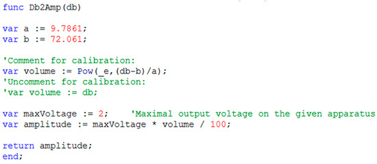 A fragment of the script’s code with the Db2Amp function needed for a sound level to voltage conversion and initial calibration.
