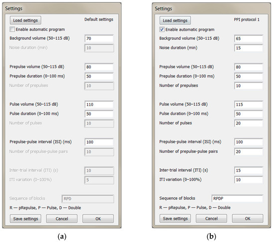Commercial acoustic startle response (ASR) and PPI testing systems are designed for both rats and mice. These systems present experimental animals with startle stimuli, detect startle responses, and provide sound isolation. Examples of these commercial systems include SR-LAB (San Diego Instruments, San Diego, CA, USA), MED-ASR-PRO1 (Med Associates, Fairfax, VT, USA), StartFear (Panlab, Barcelona, Spain), Startle Reflex apparatus (Imetronic, Marcheprime, France), and Startle Reflex system (Kinder Scientific, Chula Vista, CA, USA). The provided software for these setups allows the experimenter to define the number of stimuli of each of the three types (weak prepulse, strong pulse, and paired prepulse+pulse stimulus), their volume, and the time between stimuli. After all the parameters are set, the system executes the program automatically without any further experimenter’s participation. Although commercial systems provide all the necessary features for the PPI procedure, their high cost might be a barrier in using them. Furthermore, it is not always possible to buy expensive equipment for just one series of experiments. Another downside of the commercial systems is the closed source code, which affects their transparency and result reproducibility, thus making it impossible to upgrade or repurpose the setups [11].
