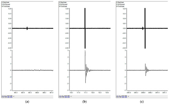 Screenshots of the Spike2 program, which show examples of ASR registration in response to different types of stimuli: (a) Single prepulse; (b) Single pulse; (c) Double prepulse+pulse. Upper channel—DAC output; lower channel—ADC input from vibration sensors with ASR.