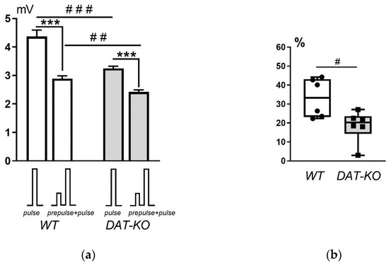 The analysis of the results of testing DAT-KO and WT rats with the PPI script showed that the amplitude of the startle response (Figure 5a) in WT animals was significantly greater than that of DAT-KO rats in response to a single sound signal (pulse, 4.4 ± 0.2 mV vs. 3.2 ± 0.1 mV; p < 0.0001) and to the combination of two sound stimuli (prepulse+pulse, 2.9 ± 0.1 mV vs. 2.4 ± 0.1 mV; p = 0.0006). In both groups of animals (WT and DAT-KO), a significant decrease in startle amplitude was observed upon presentation of two sound stimuli compared to the response to a single stimulus (p < 0.0001).