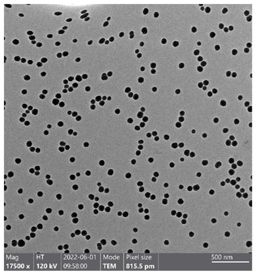 Tetraethyl orthosilicate (TEOS), NH3·H2O (30%), and ethanol were all purchased from Sigma Aldrich (St. Louis, MO, USA); water was obtained from a deionized water system. A magnetic stirring bar and a 250 mL beaker with a stirring station (Isotemp™ Hot Plate Stirrer, ambient to 400 °C, ceramic) were purchased from Fisher Scientific (Waltham, MA, USA). Transmission electronic microscope (TEM) images were obtained from a TEM system (Hitachi 7600 TEM, Hitachi, Tokyo, Japan) with an accelerating voltage of 75 keV. For ImageJ and Origin, each historic version was available; here ImageJ 1.53 t bundled with 64-bit and Origin 9.1 32-bit were used to analyze the size distributions from TEM images.