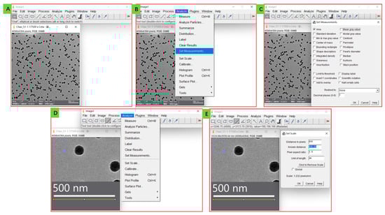 Analysis by ImageJ software: from importing the image (A) to setting measurement parameters (B,C) to calibrating the scale bar (D,E).