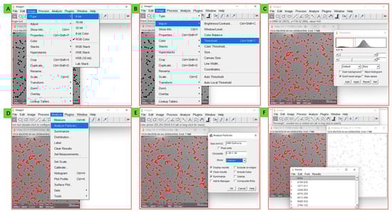Analysis by ImageJ software: adjust the image format (A), separate nanoparticles from the background (B,C), and analyze and obtain the square values of each nanoparticle (D–F).