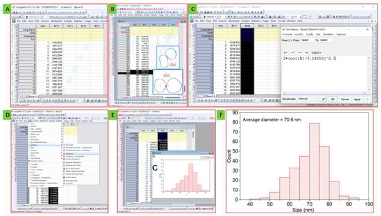 Analysis using Origin software: import the data from results of ImageJ (A), delete wrong values of linked particles (B), calculate the diameter using the diameter-square equation (C), and obtain the histogram of the precise size distribution of silica nanoparticles (D–F).