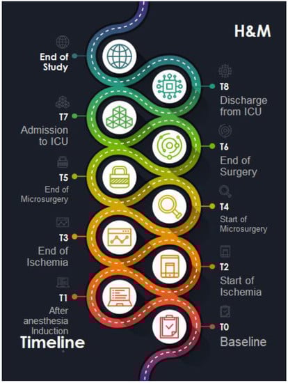The timeline starts at baseline (T0), then moves through various stages of the surgical process, including anesthesia induction, ischemia, microsurgery, and ends with the patient’s discharge from the surgical ICU.
