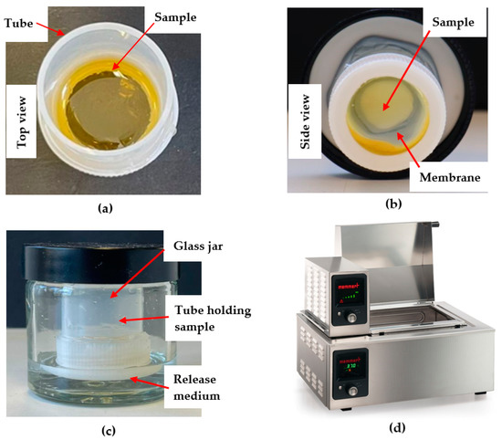 The newly developed customised Franz-type cell setup (Figure 2) consisted of a 50 × 27 mm polycarbonate-based transparent tube with screw cap closure (Thermo Fisher Scientific, Waltham, MA, USA) as donor compartment, a glass jar (50 mL) with a plastic screw cap as the receptor compartment and a temperature controlled shaking water bath (Memmert, GmbH+Co.KG, Schwabach, Germany). The dialysis membrane (diffusion area 3.80 cm2) was attached to the lower part of the plastic tube using the screw cap in which a circular opening of 22 mm in diameter had been cut (Figure 2b). To allow for a direct comparison of release data obtained from this customised setup with data generated by using the commercial Franz cell, the same sample quantities and solution volumes were used. Thus, 200 mg of the pure honeys and their respective formulations were loaded directly onto the membrane in the donor tube (Figure 2a). The donor compartment was then attached to the cap of the glass jar cap using a putty-like pressure-sensitive adhesive (Blu Tack©). The tube holding the sample was immersed into the glass jar filled with 5 mL of PBS buffer as the release medium (Figure 2c). The container was placed in the shaking water bath (Figure 2d) at a temperature of 37 °C and its shaking motion was set to Level 5 (150 strokes/min) (Figure 2). A total of 300 µL of sample were collected at 15 min, 30 min, 1 h, 3 h, 6 h, and 12 h. After each sample withdrawal (300 µL), the volume taken from the receptor chamber was replaced with the same volume of fresh PBS buffer.