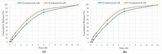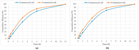 % cumulative release of compound from Jarrah honey pre-gel at RF 0.21 (a) and RF 0.53 (b) using the commercial Franz cell and the customised Franz-type cell setup.