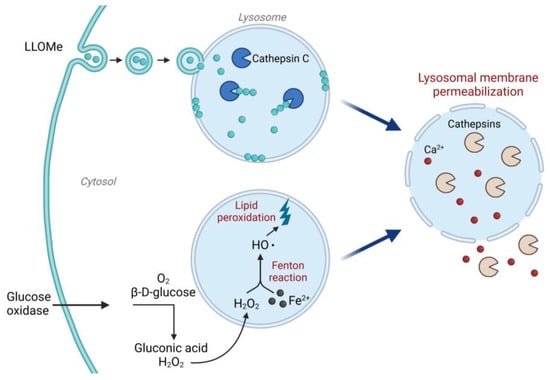 Mechanism of action for LLOMe and glucose oxidase. LLOMe is taken up via endocytosis and converted by cathepsin C in the lysosome to a membranolytic polymer. The LLOMe polymer acts directly on the lysosomal membrane to trigger lysosomal membrane permeabilization and release of lysosomal content. Glucose oxidase produces H2O2 by catalyzing the oxidation of β-D-glucose to gluconic acid. H2O2 enters the lysosome via diffusion and can then react with lysosomal iron through the Fenton reaction, inducing oxidative stress and lipid peroxidation, which cause lysosomal membrane damage. Image created with BioRender.com (accessed on 1 August 2023).