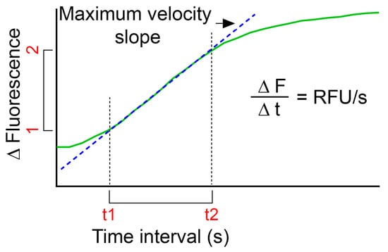 - Use the plot of relative fluorescence over time as obtained above and define the highest slope of the curve (dotted blue line in Figure 3);