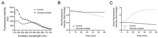 (A) Emission spectra of acridine orange (Ex 465 nm) in J774 controls and cells treated with glucose oxidase for 90 min. Changes in acridine orange, (B) red fluorescence (Em 710 nm) and (C) green fluorescence (Em 535 nm) in cells exposed to 18 µg/mL glucose oxidase (0–60 min).