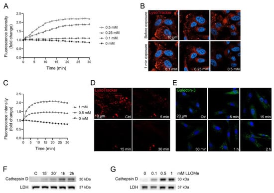 WM278 malignant melanoma cells (A,B) and AG01518 human fibroblasts (C–G) were exposed to 0–1 mM LLOMe. (A) Changes in acridine orange green fluorescence over time. (B) Live cell images before and after LLOMe exposure (1 min) of LysoTracker-stained cells (100 nM, 30 min). (C) Changes in acridine orange green fluorescence over time. (D) Live cell imaging of LysoTracker-stained cells (100 nM, 30 min) before and after LLOMe exposure (1 mM). (E) Immunostaining of galectin-3 (BD Pharmingen #556904, San Diego, CA, USA, 1:100) in cells exposed to 1 mM LLOMe. (F) Immunoblotting of cathepsin D in cytosolic fractions showing time-dependent increase in cells exposed to 1 mM LLOMe and (G) concentration-dependent increase after exposure to LLOMe for 1 h. Unedited immunoblots in Supplementary Material. Images were obtained using a Zeiss LSM 700 (D,E) or 800 (B) confocal microscope (40× objective, Zen Blue 3.1 software).