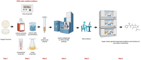 Diagram of the steps included in the protocol to improve the diversification and/or the production yield of fungal secondary metabolites. Step 1: recovery of the fungal culture; step 2: performing cultures of the selected fungal strain under different variables (time of growth, temperature of growth, culture nutrients concentration, culture salts concentration, and mode of growth (shaking or still)); step 3: extraction and SPE clean-up of extracts from the fungal cultures; step 4: analysis of SPE fractions by UHPLC-HRMS/MS or by HPLC-UV-MS; step 5: chemometrics analysis; step 6: selection of the improved conditions of fungal cultures growth for a large scale culture towards the isolation of secondary metabolites. This figure was prepared using a free version of BioRender®.