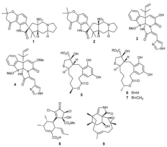 - Mercado-Marin, E.; Garcia-Reynaga, P.; Romminger, S.; Pimenta, E.F.; Romney, D.; Lodewyk, M.; Williams, D.E.; Andersen, R.J.; Miller, S.; Tantillo, D.; et al. Total synthesis and isolation of citrinalin and cyclopiamine congeners. Nature 2014, 509, 318–324. [Google Scholar] [CrossRef] [PubMed]
