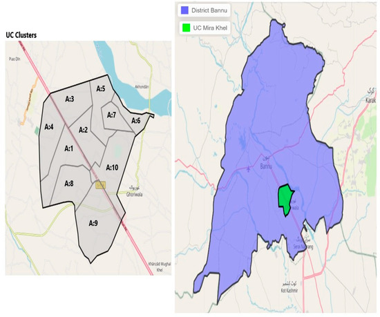 Map of selected district and HRUCs and the intervention clusters (Bannu, Mira Khel).